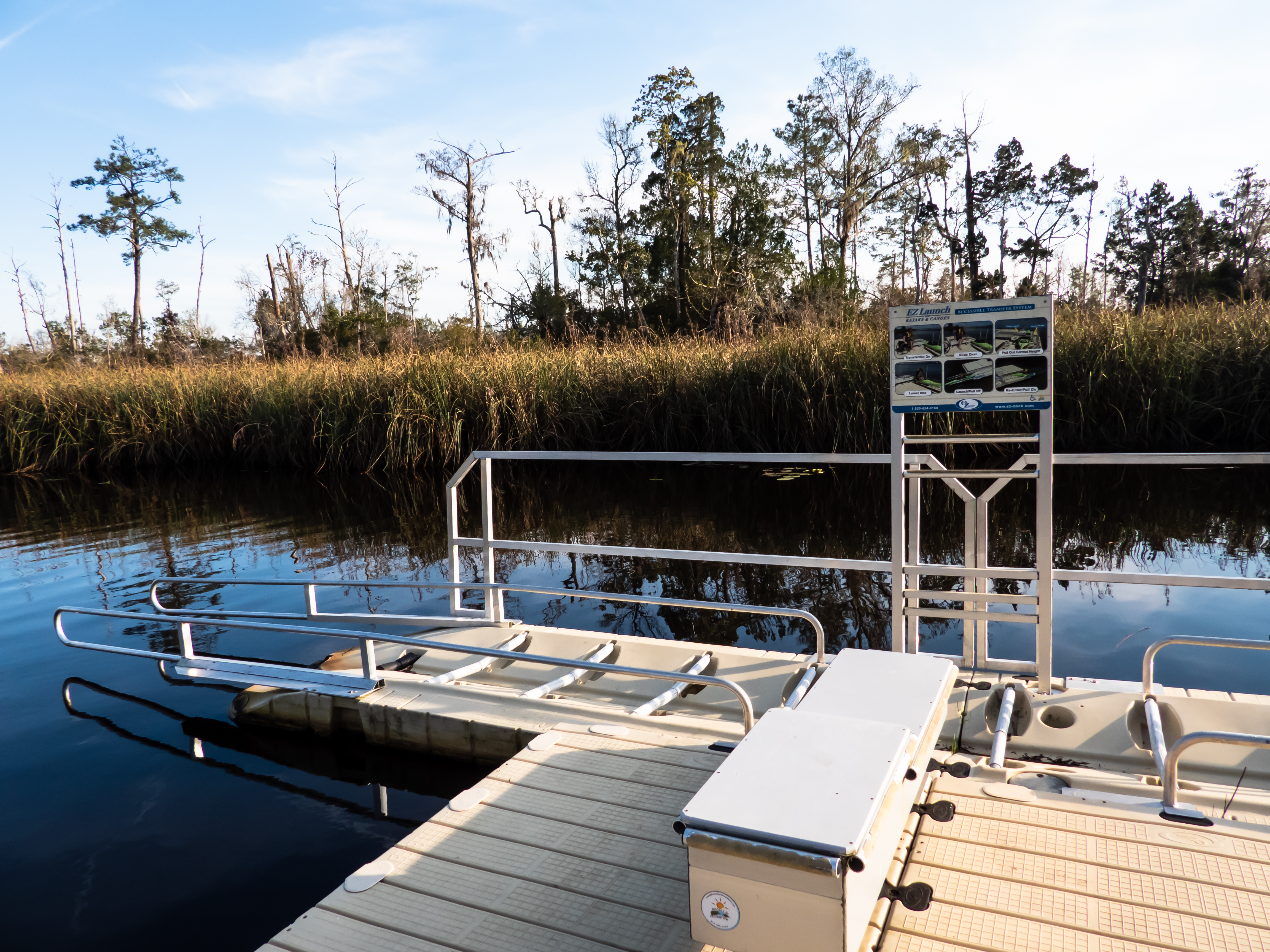 Eastern BluebirdsThe other day use area is the boat ramp. You can rent canoes at the ranger station, or bring your own boat. There’s also a nice fish cleaning station if you like fishing. The restroom here is a porta-potty, but it’s a large accessible one, and it’s clean. Speaking of accessibility, they also have a handy transfer system to make kayaking accessible for all.