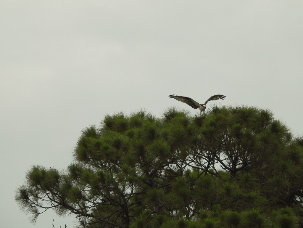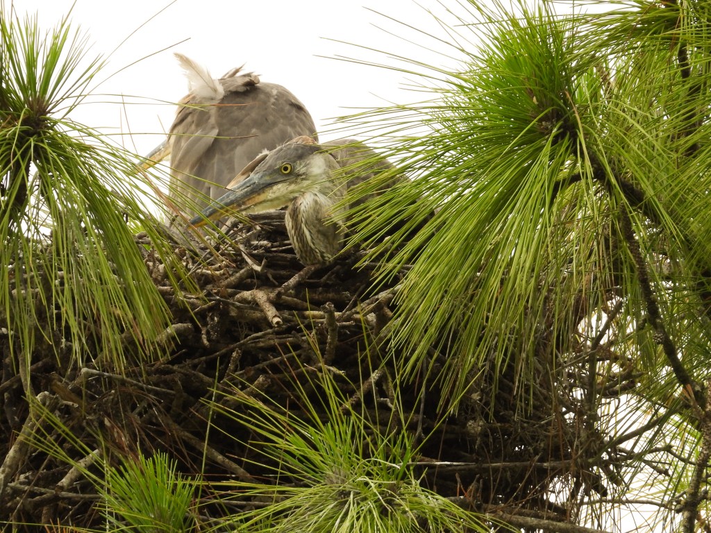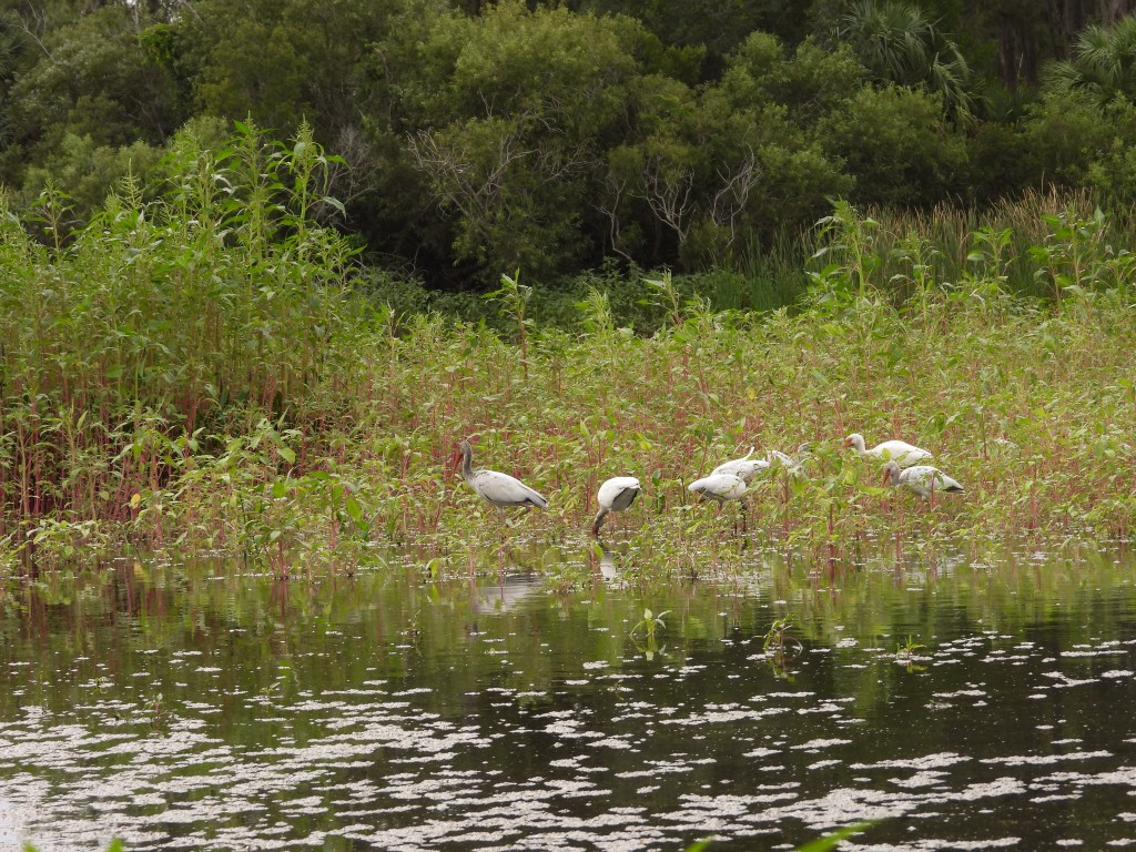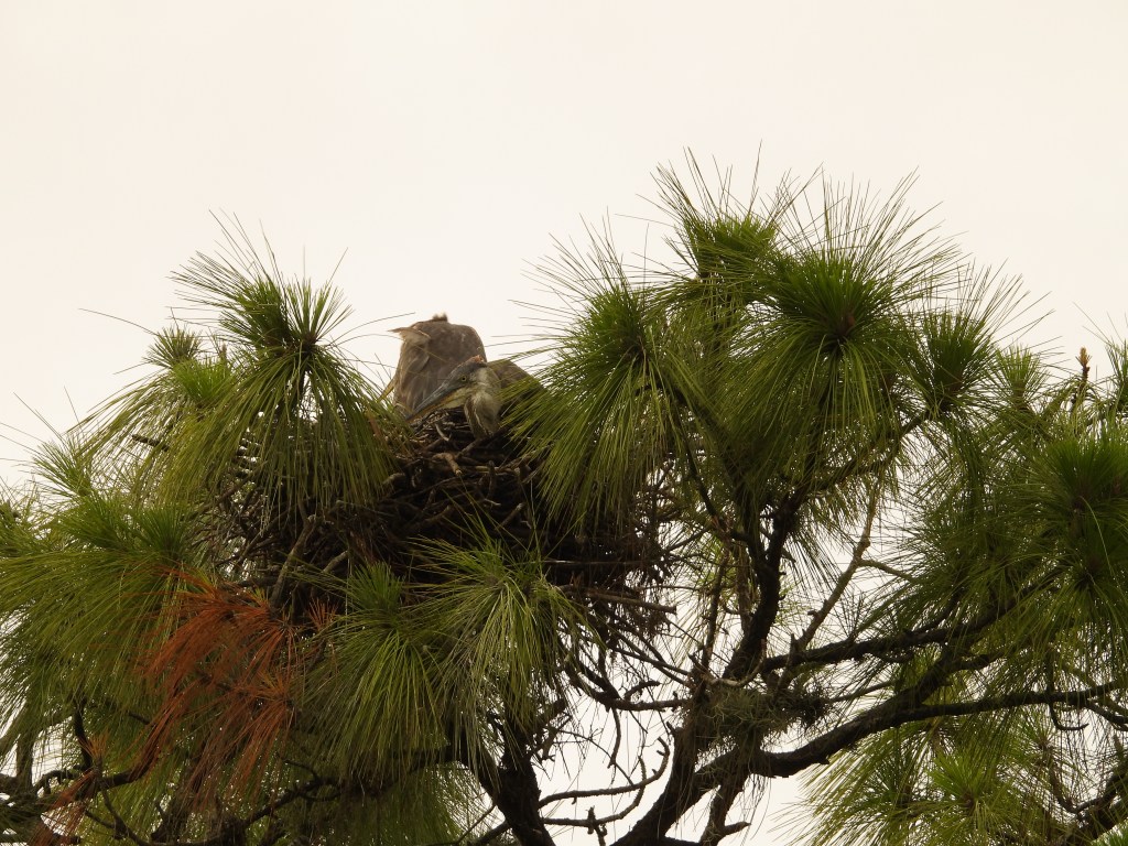 White pelicans with a black-necked stilt flyover. There’s also a great blue heron hiding in the reeds to the left. He gives a good size comparison for the white pelicans. One of the largest birds in North America, the American white pelican’s wing span is nine feet!Just a nice little view.We didn’t see any alligators this day, but we did last time. A good rule of thumb is to just expect there to be alligators in any body of freshwater in Florida.There are a couple of little bridges in the park. It was dry under them, but I’m sure that’s not the case in the rainy season.Who’s hiding way up there?A couple of great blue heron nestlings are getting huge and look just about ready to leave the nest.Those pelicans look sleepy. One lone roseate spoonbill stopped by for a visit.Looks like he’s taking a nap too.It may not be a huge lake, but it really is pretty! It was nice of the rain to give us a little break.One of several great blue herons. They’re such patient hunters!There were a lot of juvenile white ibis. Have you ever seen juveniles? They start off almost completely brown and gradually become pure white over a couple of years.Osprey hanging out in the treetops.Did you know osprey were once highly endangered due to the use of DDT (a pesticide that caused egg shells to be too thin to be viable)? Banning DDT in 1972 in the US contributed to a great rebound success story for these birds.