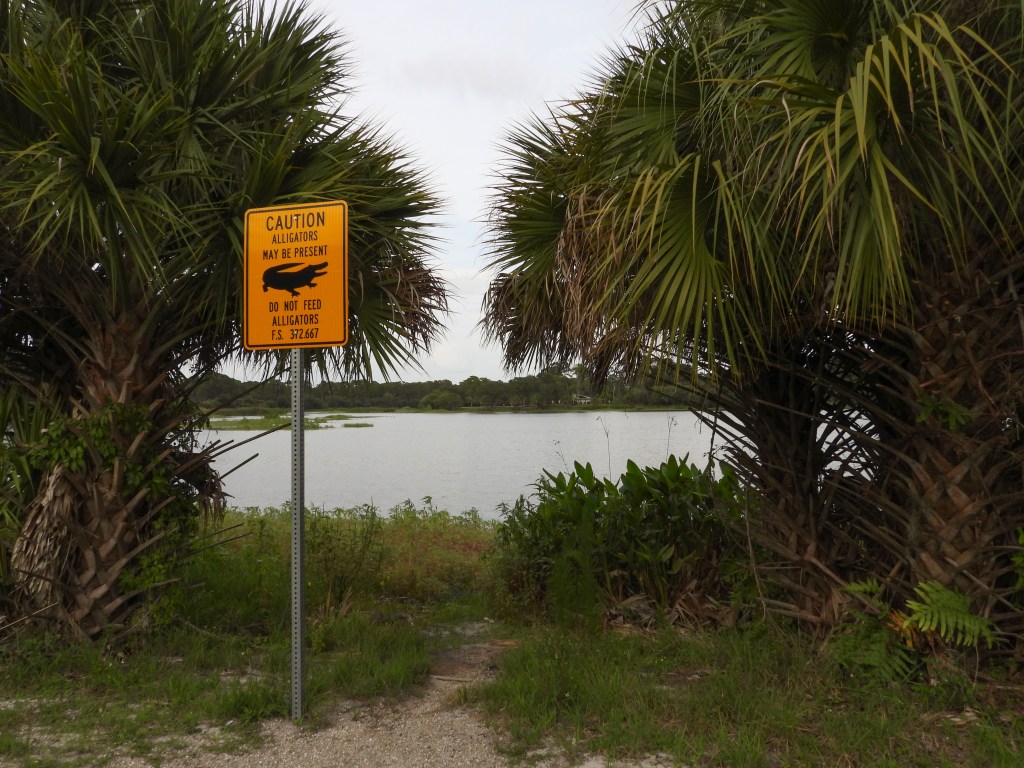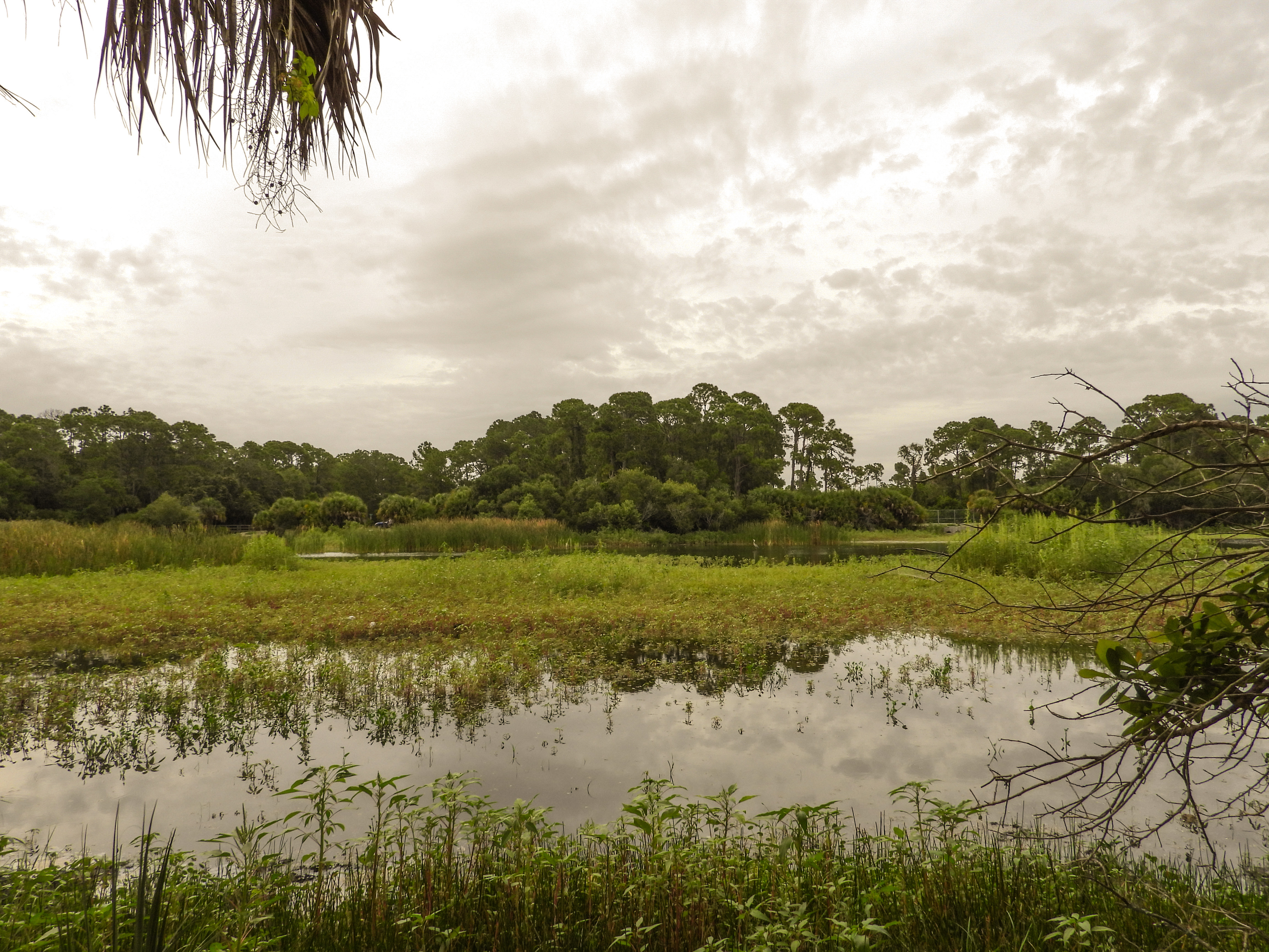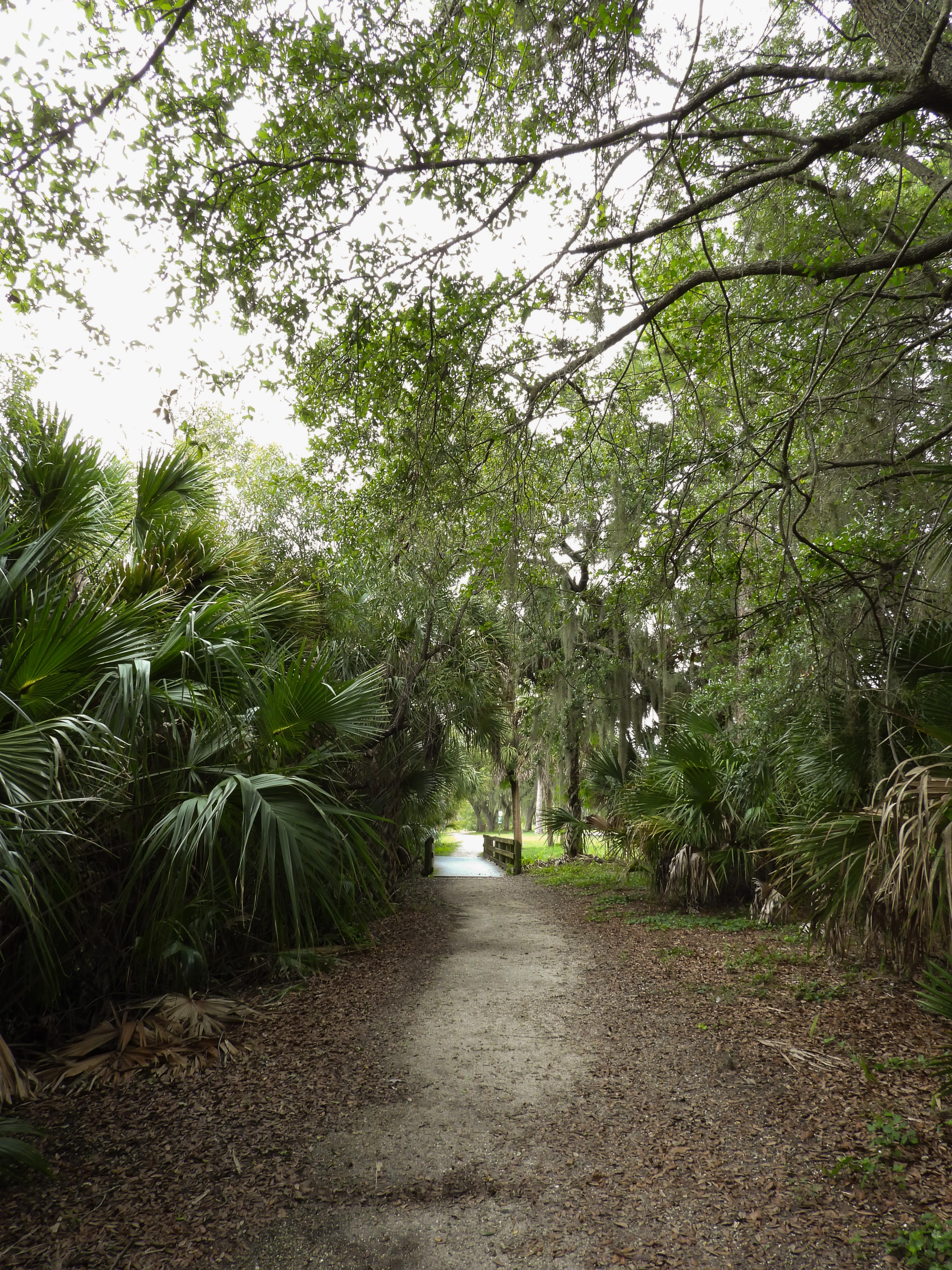 White pelicans with a black-necked stilt flyover. There’s also a great blue heron hiding in the reeds to the left. He gives a good size comparison for the white pelicans. One of the largest birds in North America, the American white pelican’s wing span is nine feet!Just a nice little view.We didn’t see any alligators this day, but we did last time. A good rule of thumb is to just expect there to be alligators in any body of freshwater in Florida.There are a couple of little bridges in the park. It was dry under them, but I’m sure that’s not the case in the rainy season.Who’s hiding way up there?A couple of great blue heron nestlings are getting huge and look just about ready to leave the nest.Those pelicans look sleepy. One lone roseate spoonbill stopped by for a visit.Looks like he’s taking a nap too.It may not be a huge lake, but it really is pretty! It was nice of the rain to give us a little break.One of several great blue herons. They’re such patient hunters!There were a lot of juvenile white ibis. Have you ever seen juveniles? They start off almost completely brown and gradually become pure white over a couple of years.Osprey hanging out in the treetops.Did you know osprey were once highly endangered due to the use of DDT (a pesticide that caused egg shells to be too thin to be viable)? Banning DDT in 1972 in the US contributed to a great rebound success story for these birds.