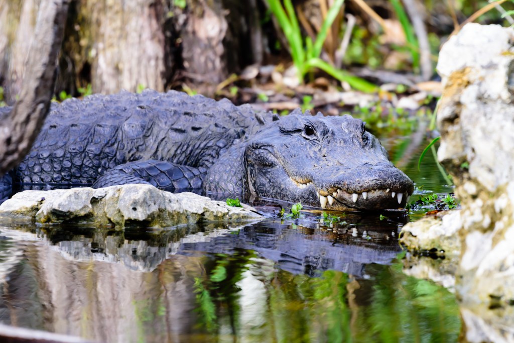 The only safe way to get photos like this of an alligator is with a telephoto lens. You’ll often see videos of people getting dangerously close to alligators, hoping to get a memorable photo of one. This is definitely not advisable. While an alligator may seem docile and uninterested in you, they are wild and dangerous animals and deserve plenty of respect and distance.
