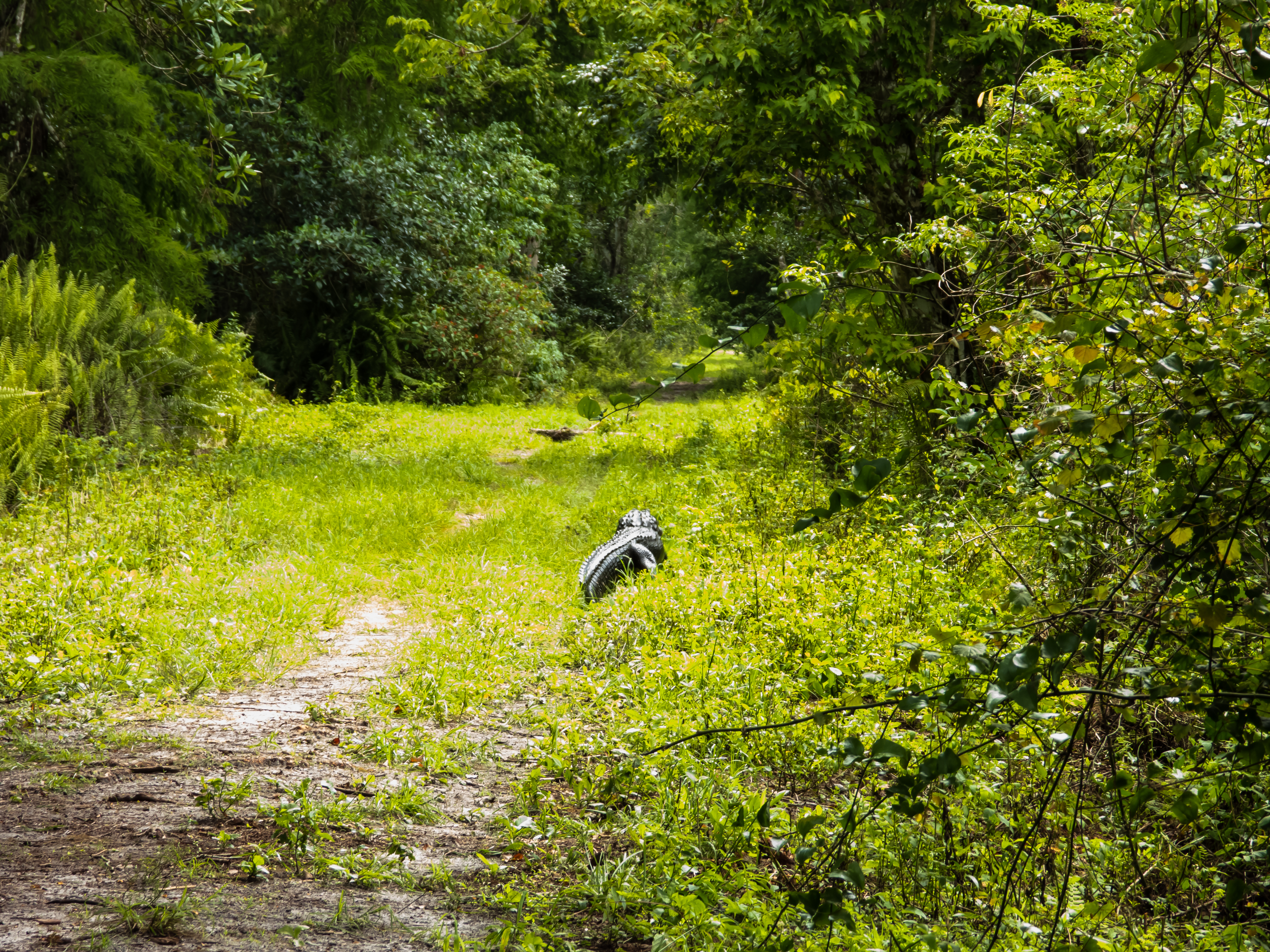 So what do you do if you’re walking along and come upon an alligator in the middle of, or near the edge of the trail? If the alligator doesn’t seem to want to carry on and get itself back to the water, the best thing to do is just wait it out from a safe distance. Try walking heavily toward the alligator (but not too close!) and see if it will move off the trail. If it doesn’t, and you can’t pass safely, you’ll just have to turn around and leave it alone. Remember, this is his home. You’re just a guest.