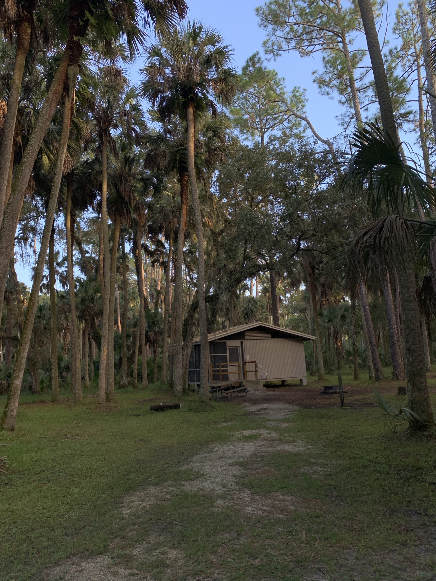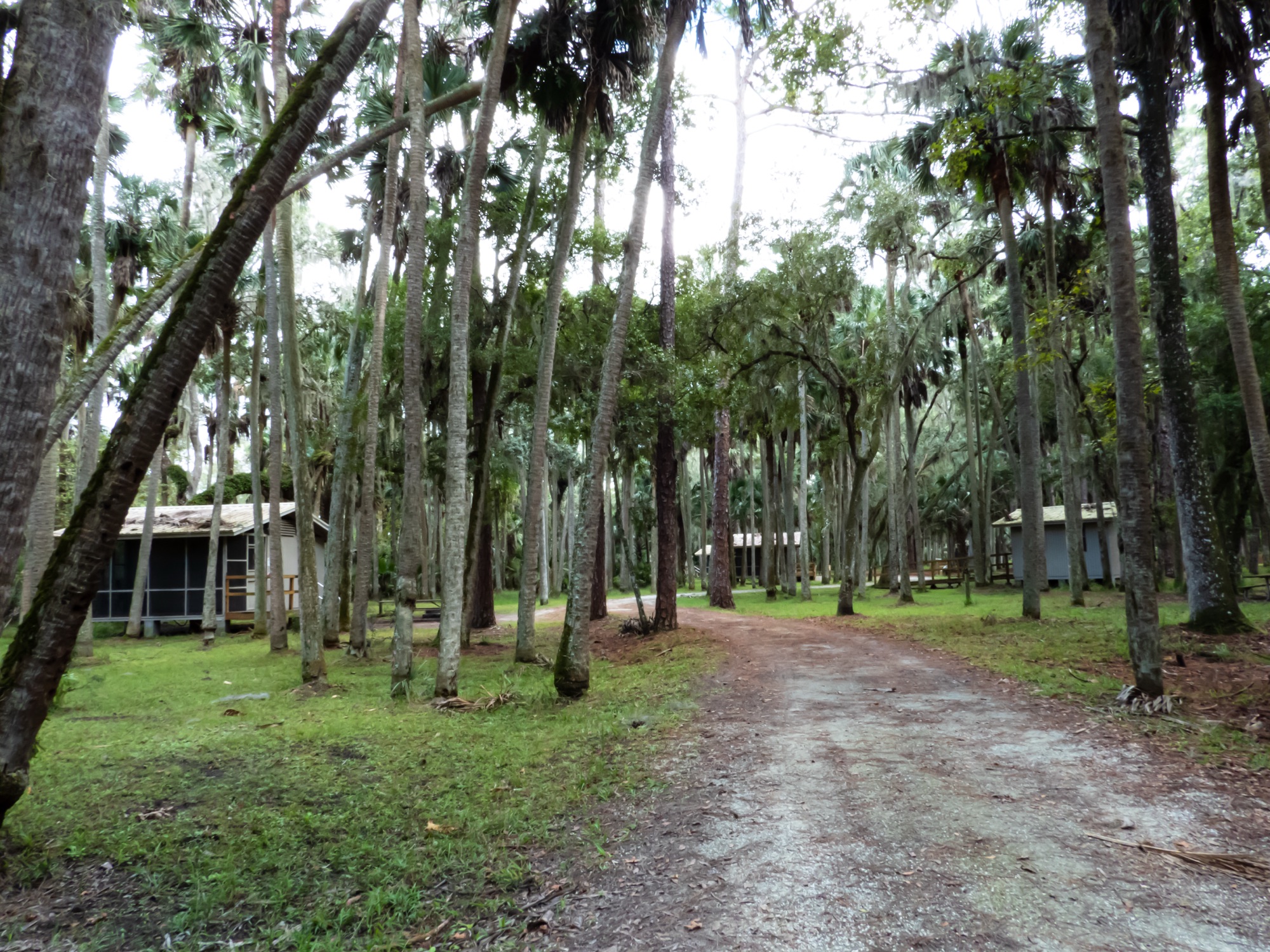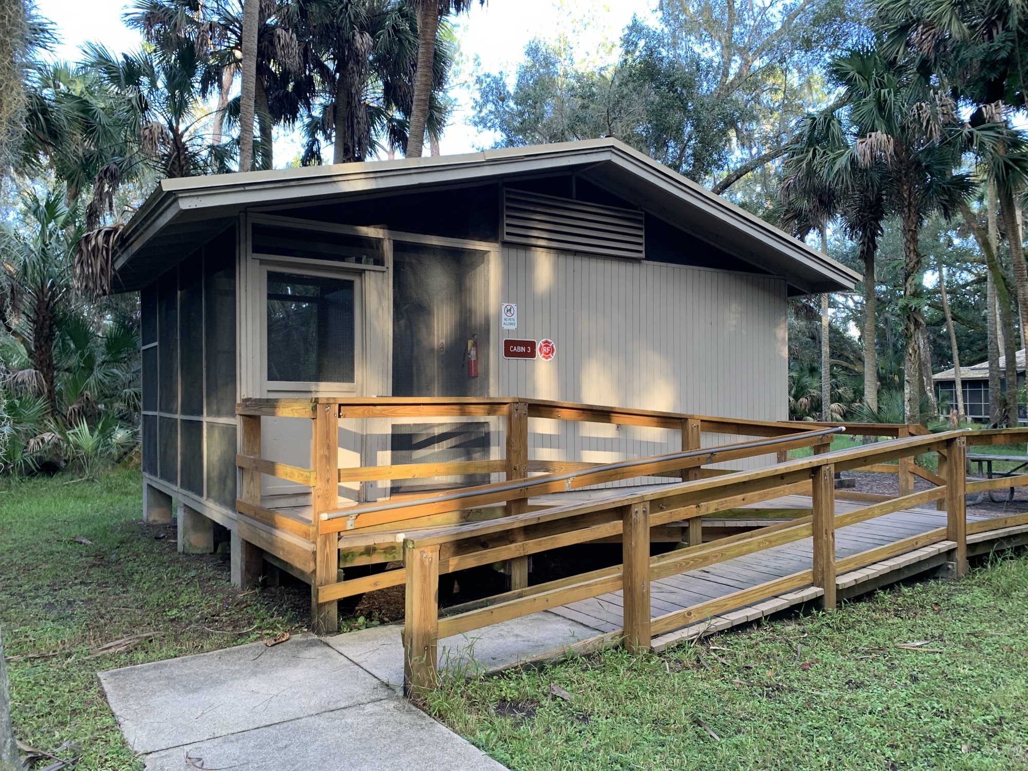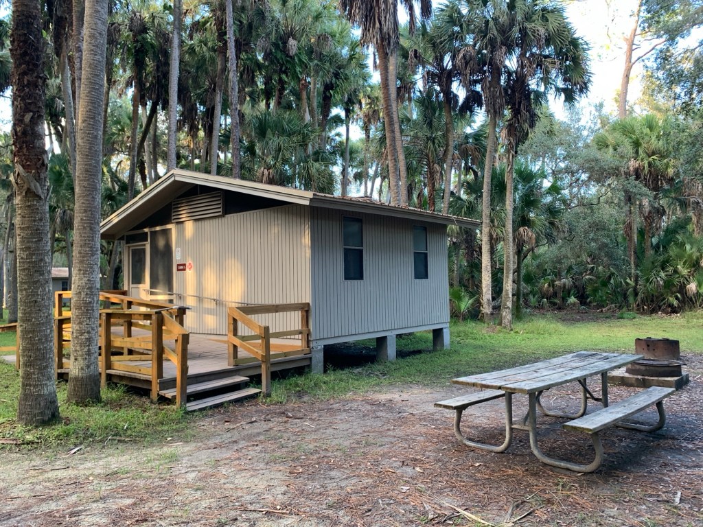 The camp area is shady, and it appears that it can also be quite muddy during periods of heavy rain. The tent sites are fairly large, especially on the outer loop. The inner loop is less secluded since the sites back into one another, but still acceptable. If you prefer your site backing up to the woods, definitely book a site on the outer loop. The cabins are adorable little buildings with electricity and fans. No cooking is allowed in the cabins and pets are only allowed on the tent sites. There’s one cabin that is fully accessible and includes a ramp and path leading to the bath house. Hikers need to pass through the camp area to get to the trails that go through the pine flatwoods. Check the map when choosing your site if you don’t want foot traffic going past your site frequently.