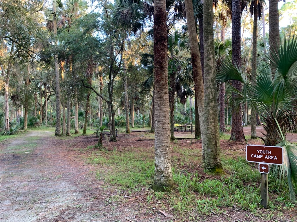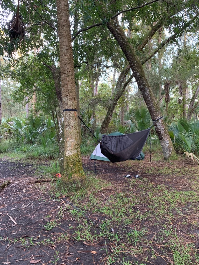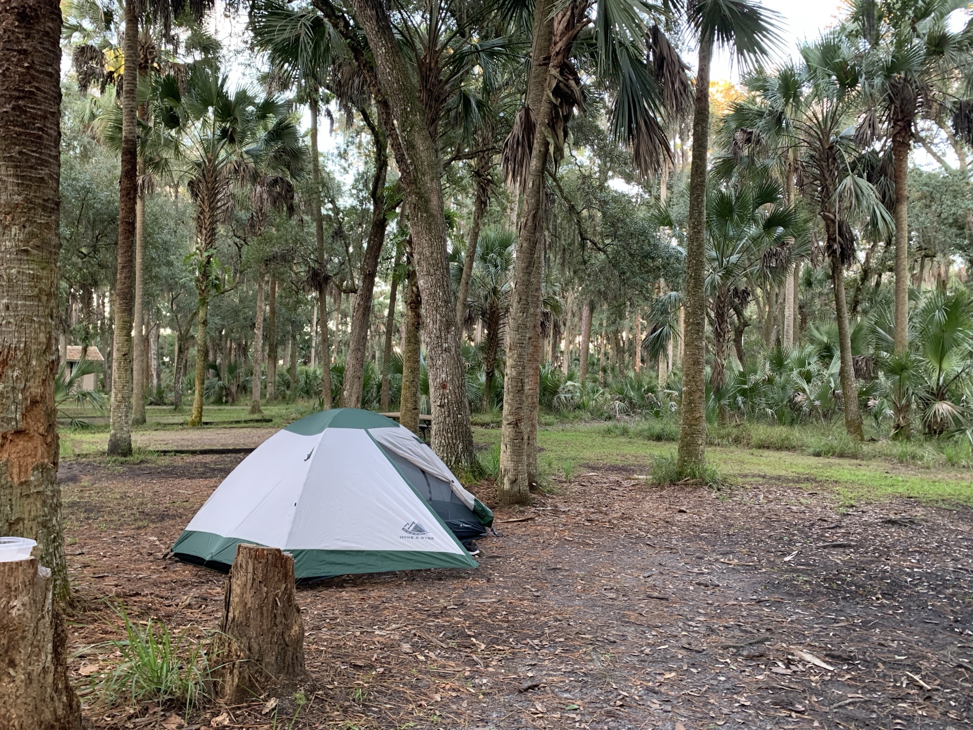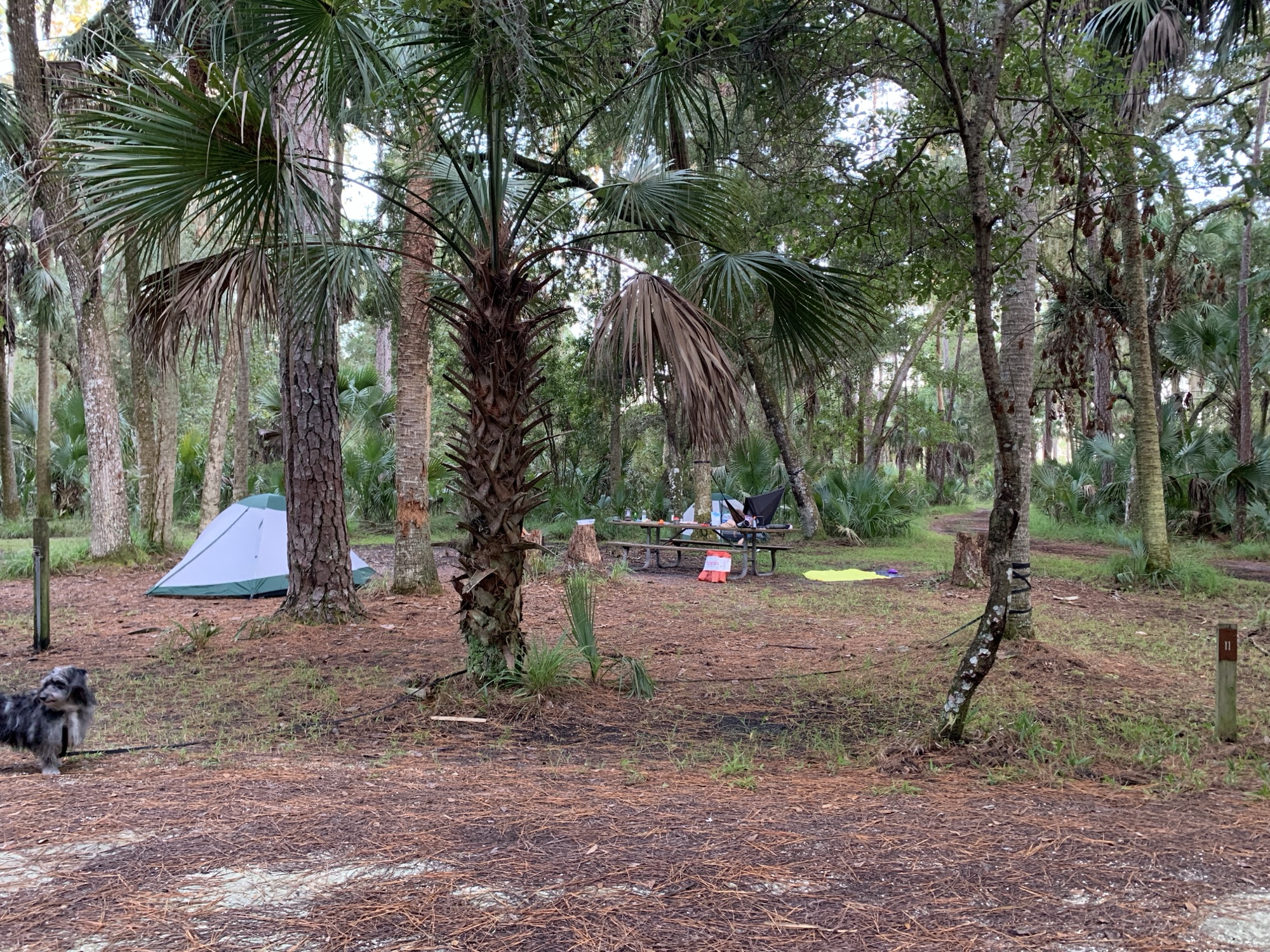 The camp area is shady, and it appears that it can also be quite muddy during periods of heavy rain. The tent sites are fairly large, especially on the outer loop. The inner loop is less secluded since the sites back into one another, but still acceptable. If you prefer your site backing up to the woods, definitely book a site on the outer loop. The cabins are adorable little buildings with electricity and fans. No cooking is allowed in the cabins and pets are only allowed on the tent sites. There’s one cabin that is fully accessible and includes a ramp and path leading to the bath house. Hikers need to pass through the camp area to get to the trails that go through the pine flatwoods. Check the map when choosing your site if you don’t want foot traffic going past your site frequently.