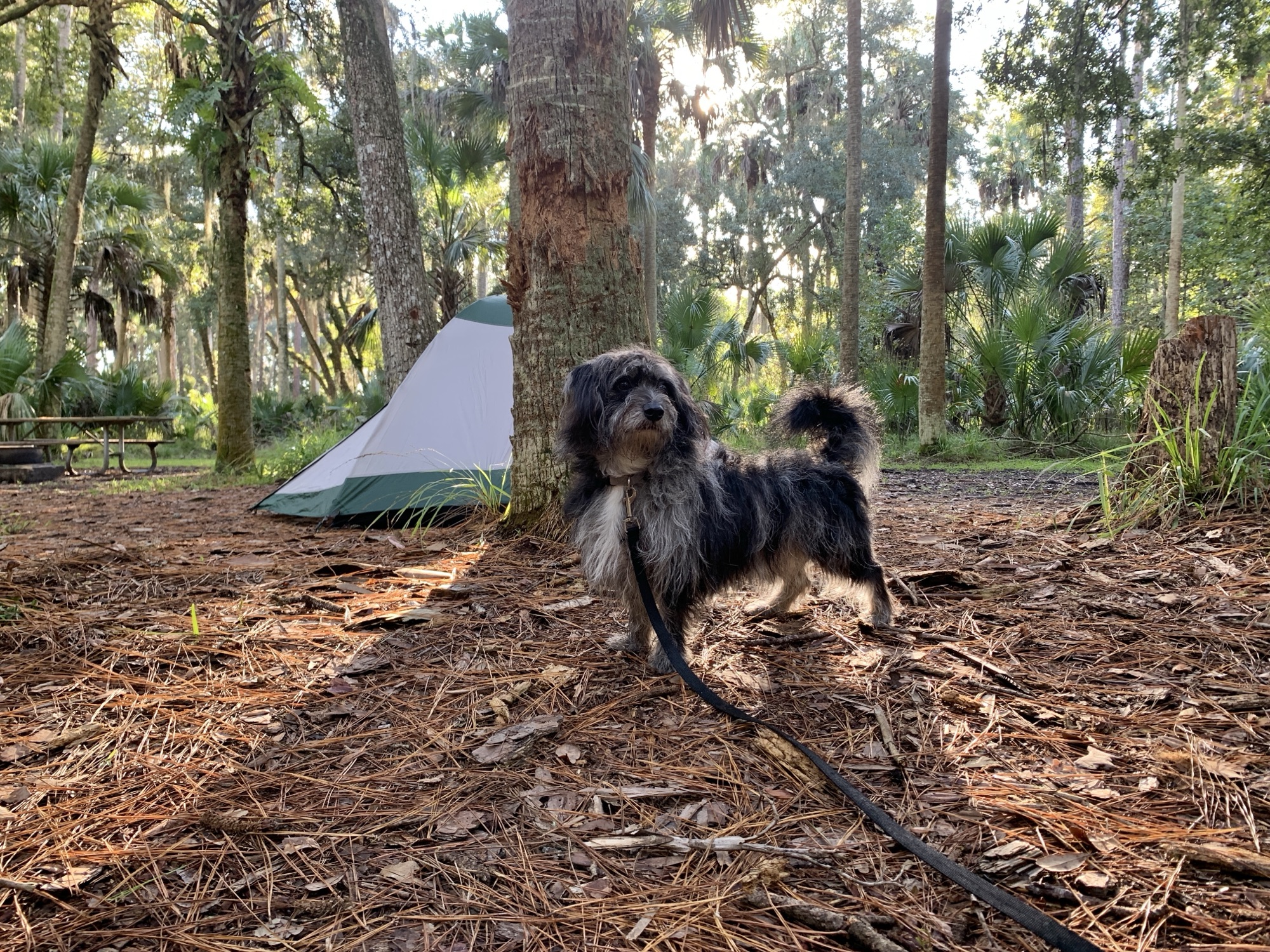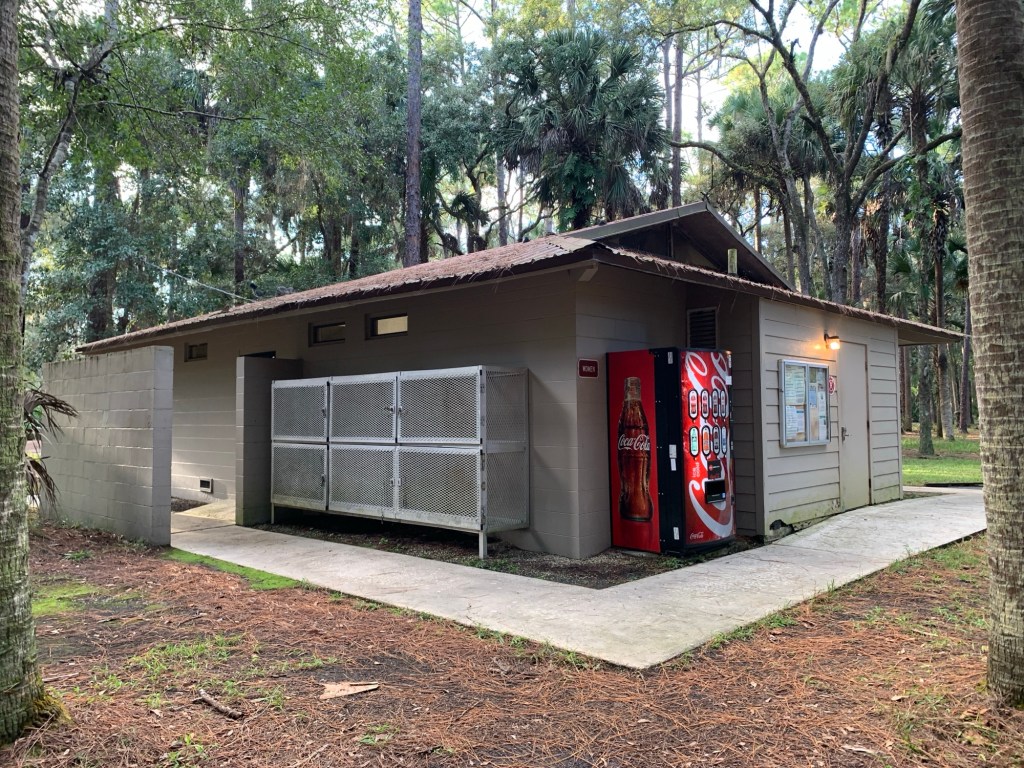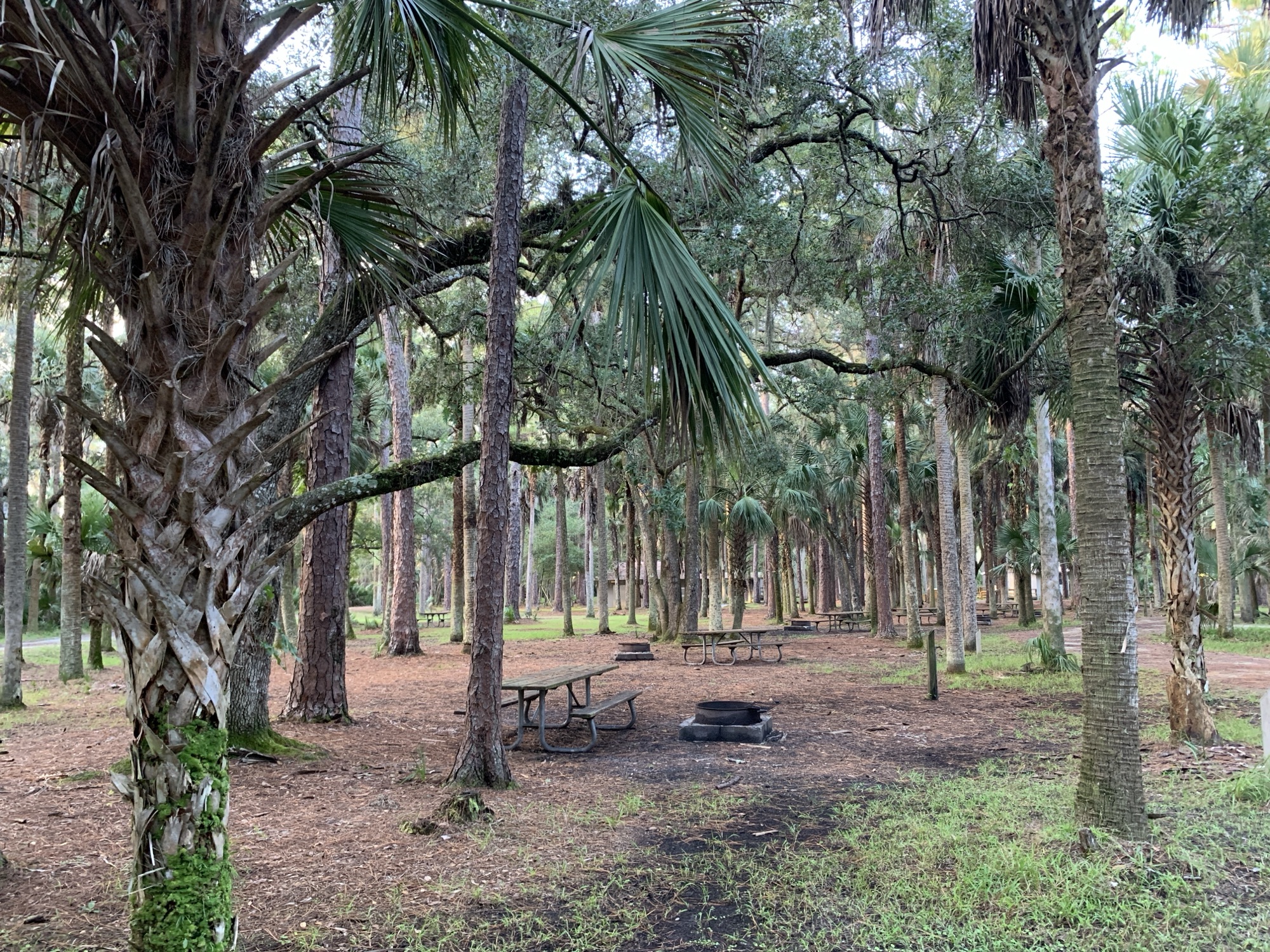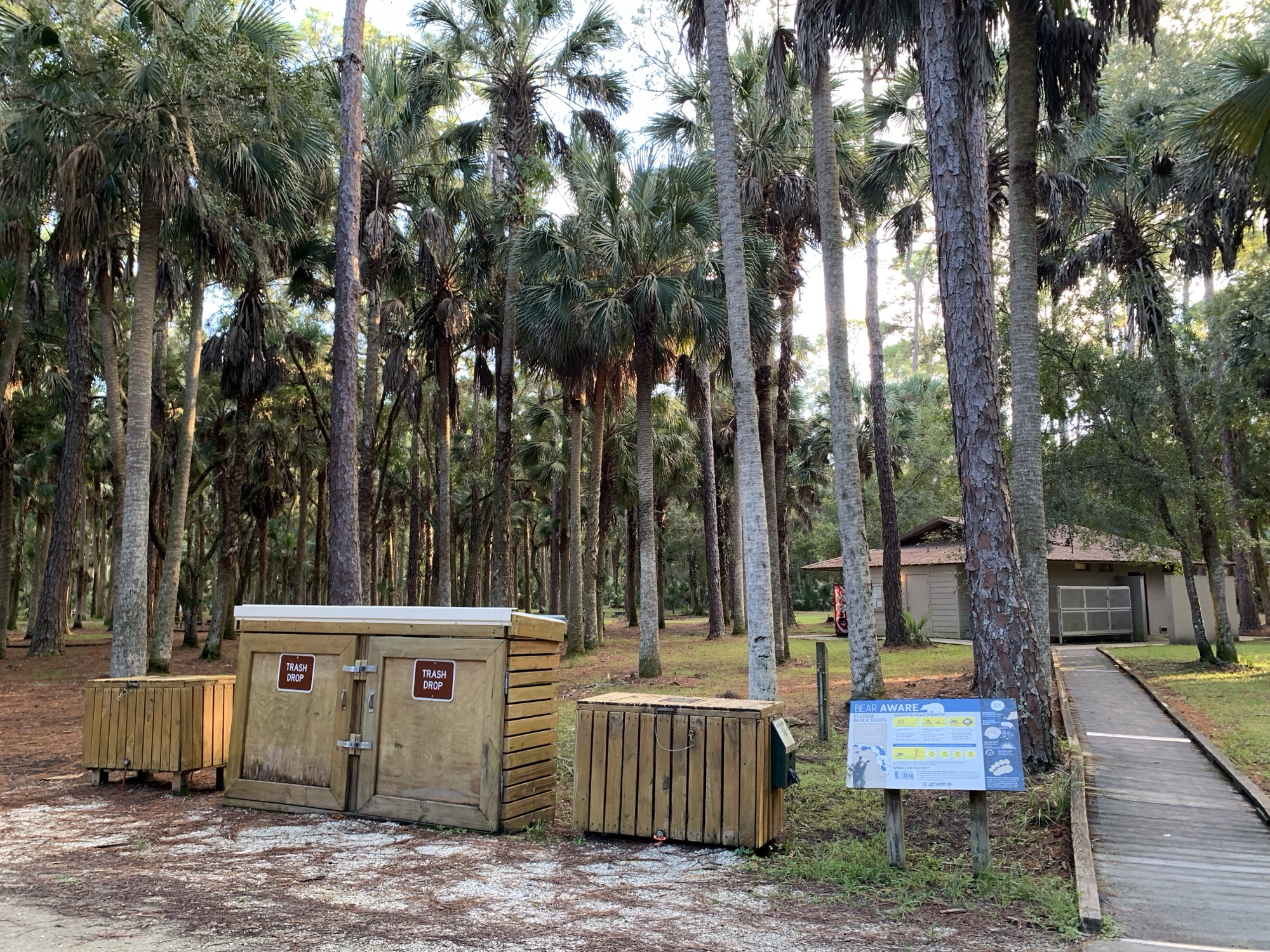 The camp area is shady, and it appears that it can also be quite muddy during periods of heavy rain. The tent sites are fairly large, especially on the outer loop. The inner loop is less secluded since the sites back into one another, but still acceptable. If you prefer your site backing up to the woods, definitely book a site on the outer loop. The cabins are adorable little buildings with electricity and fans. No cooking is allowed in the cabins and pets are only allowed on the tent sites. There’s one cabin that is fully accessible and includes a ramp and path leading to the bath house. Hikers need to pass through the camp area to get to the trails that go through the pine flatwoods. Check the map when choosing your site if you don’t want foot traffic going past your site frequently.