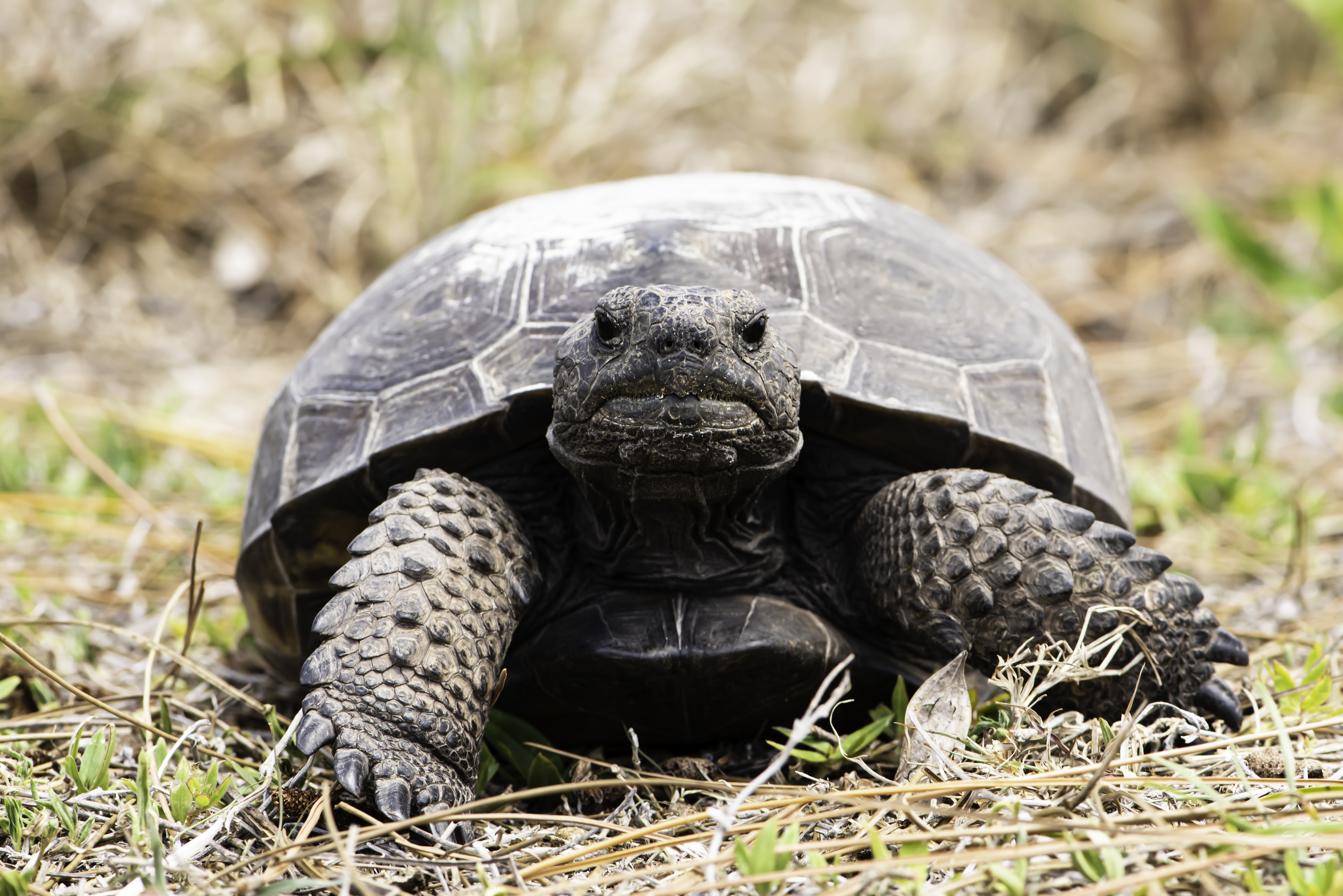 Let’s talk about my favorite reptile for a minute. Okay, so it’s tied with the alligator for my favorite, but let’s talk about the gopher tortoise. Gopher tortoises are a keystone species. This means that their existence helps other species exist. In fact, their burrows can house around 350 different species! Among these are the burrowing owl and the Indigo snake, rabbits, mice, gopher frogs, tons of invertebrates and many others. Their burrows are generally fifteen feet long and six feet deep. These guys can live upwards of sixty years. Because these tortoises are a state protected species, it is illegal to pick them up or harass them in any way. The only time it’s acceptable to touch one is if you’re helping to move it out of danger, such as when it’s crossing the road. Grab the tortoise gently but firmly from the sides and always move him in the direction in which he was originally traveling. And remember, tortoises are land animals so never, ever put them in a body of water.