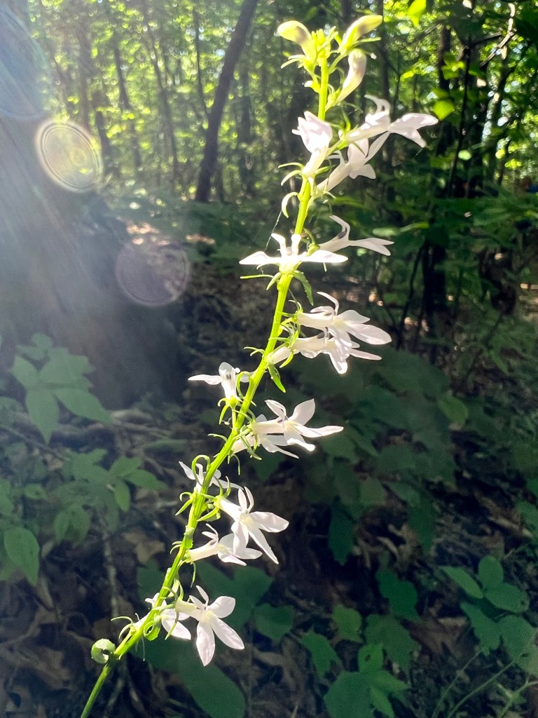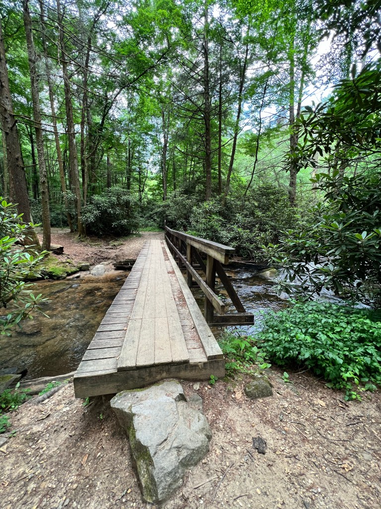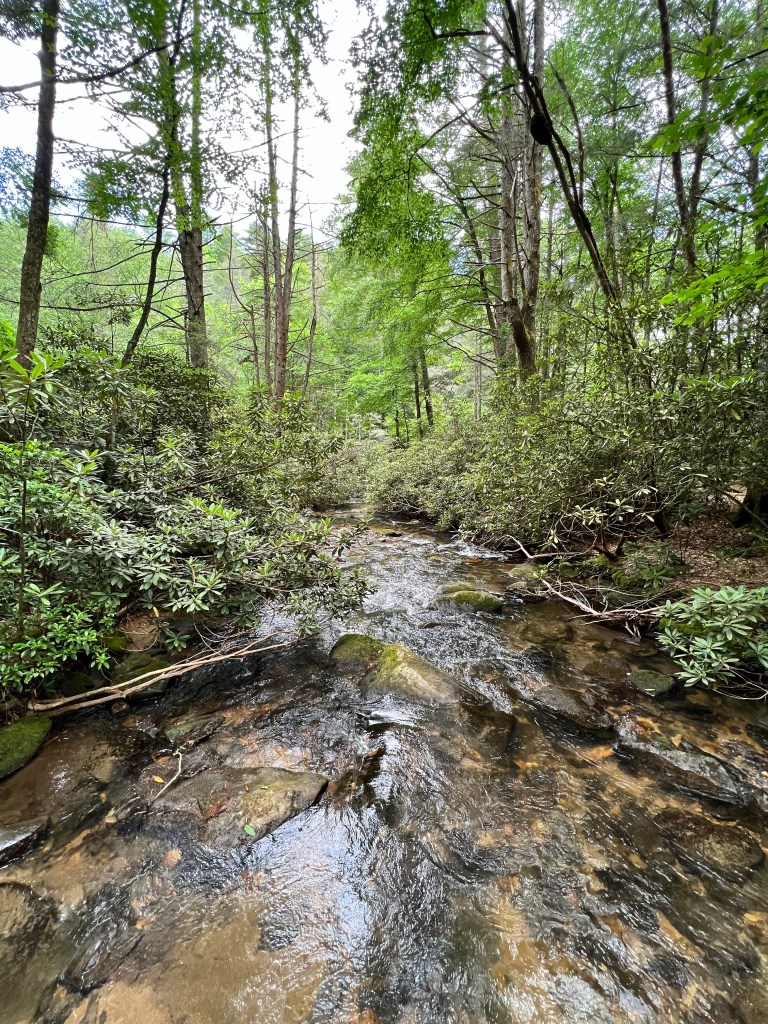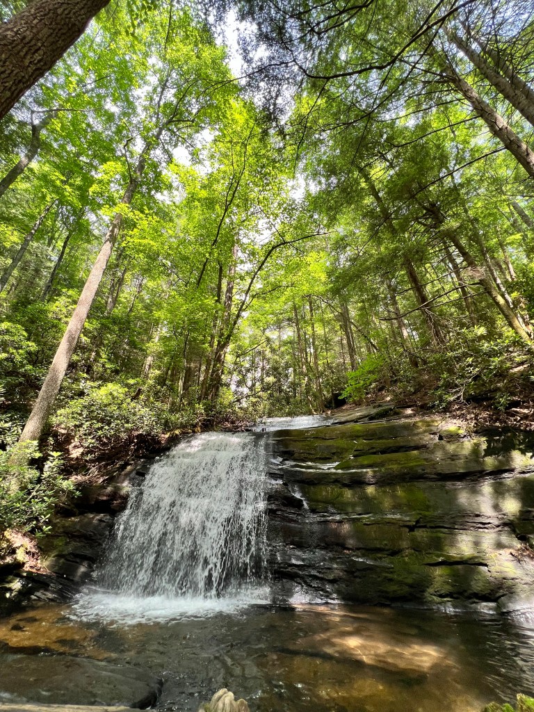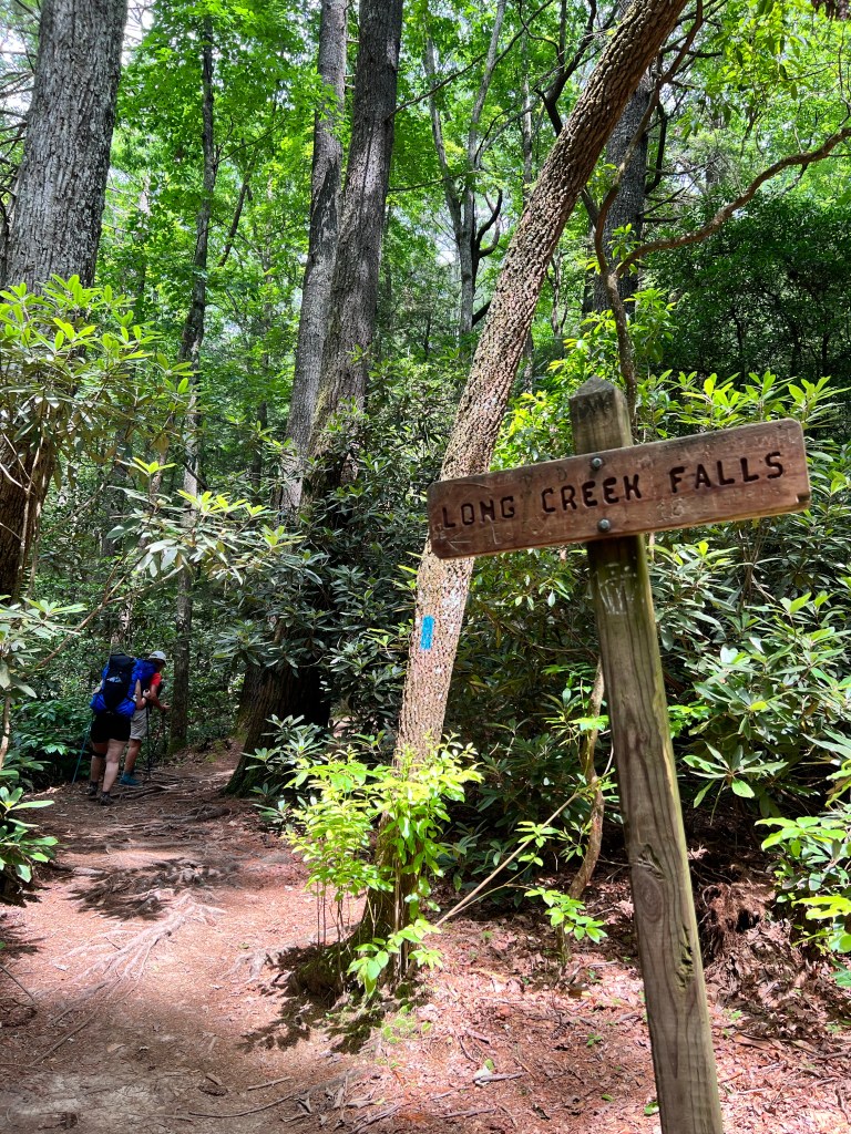 We hiked a little over eight miles that first day. In Florida, eight miles does not seem like much. But those miles kicked my butt! Going uphill took my breath away, and going downhill killed my knees. This is where I tell you that hiking is not always beautiful. It didn’t happen until the second day, but there was a period where I almost cried because my knees were hurting so badly. I’m just not used to going downhill like that. Cathy was having trouble with her knee too. But we pressed on. And on and on. We took a little side trail to Long Creek Falls. It was absolutely beautiful there! The cool mist coming off the waterfall felt so good after being so hot! We refilled our water bottles here. I just put my sawyer filter right on my smart water bottle and drank it, and it was so cool and refreshing!