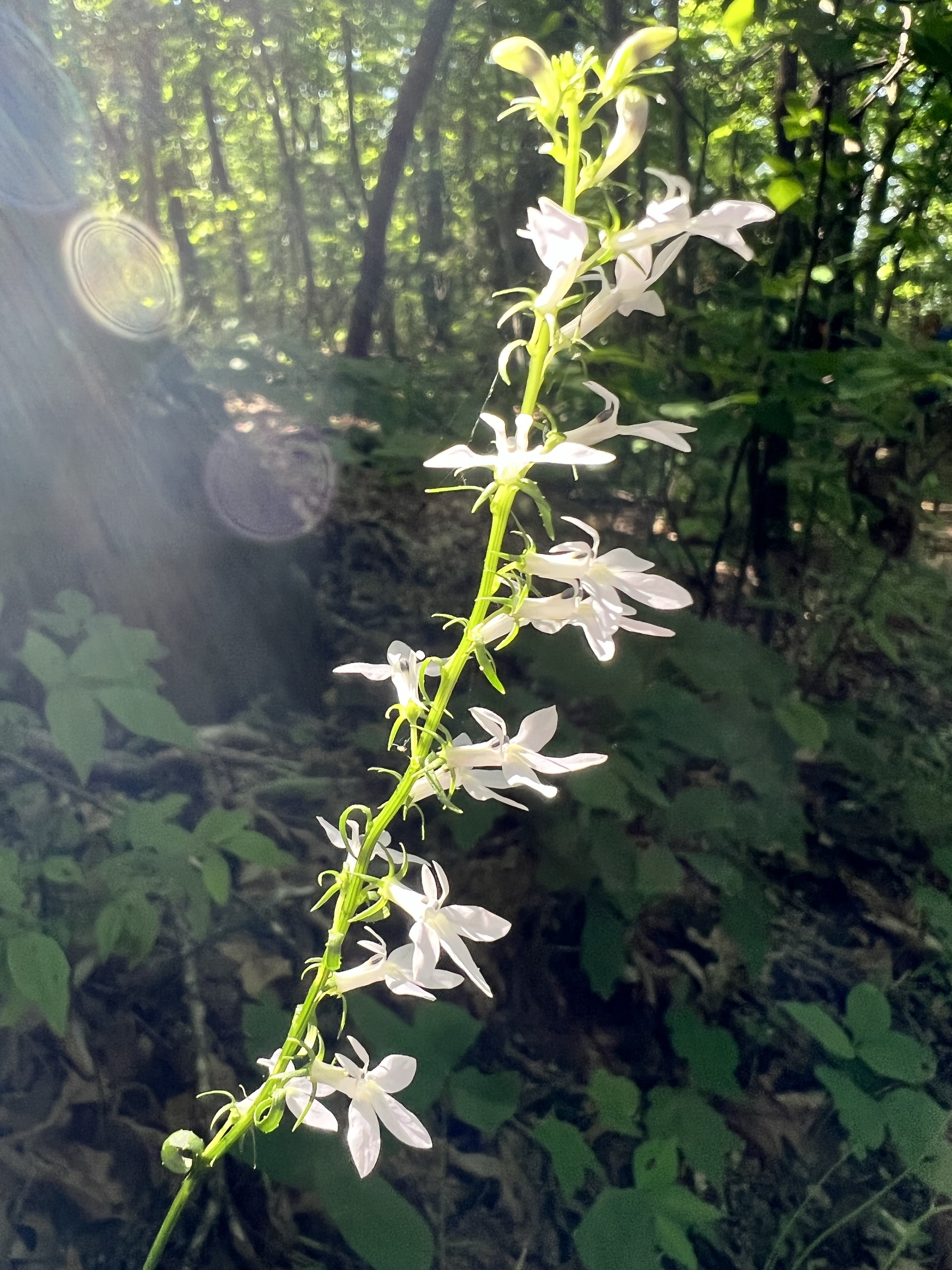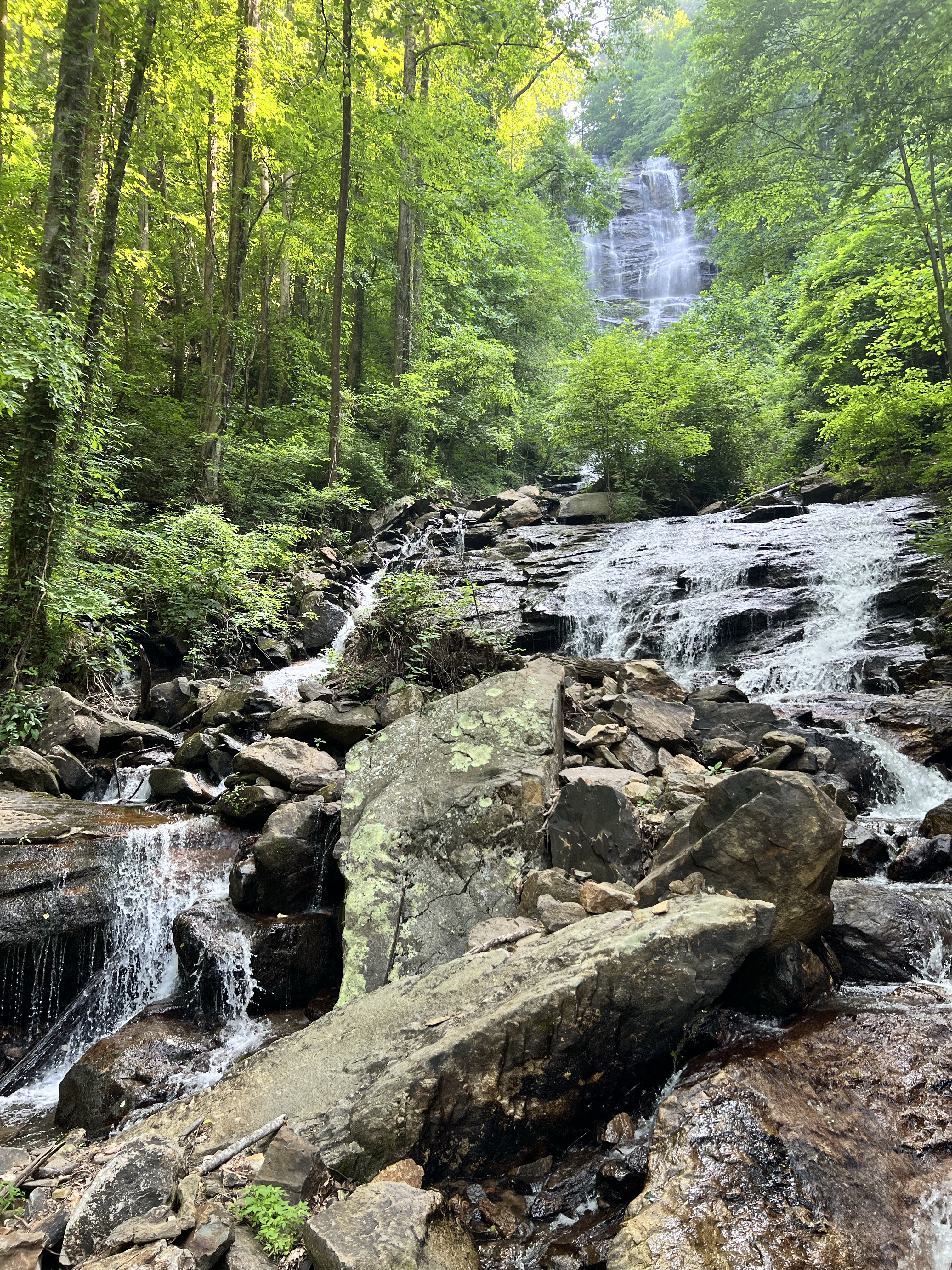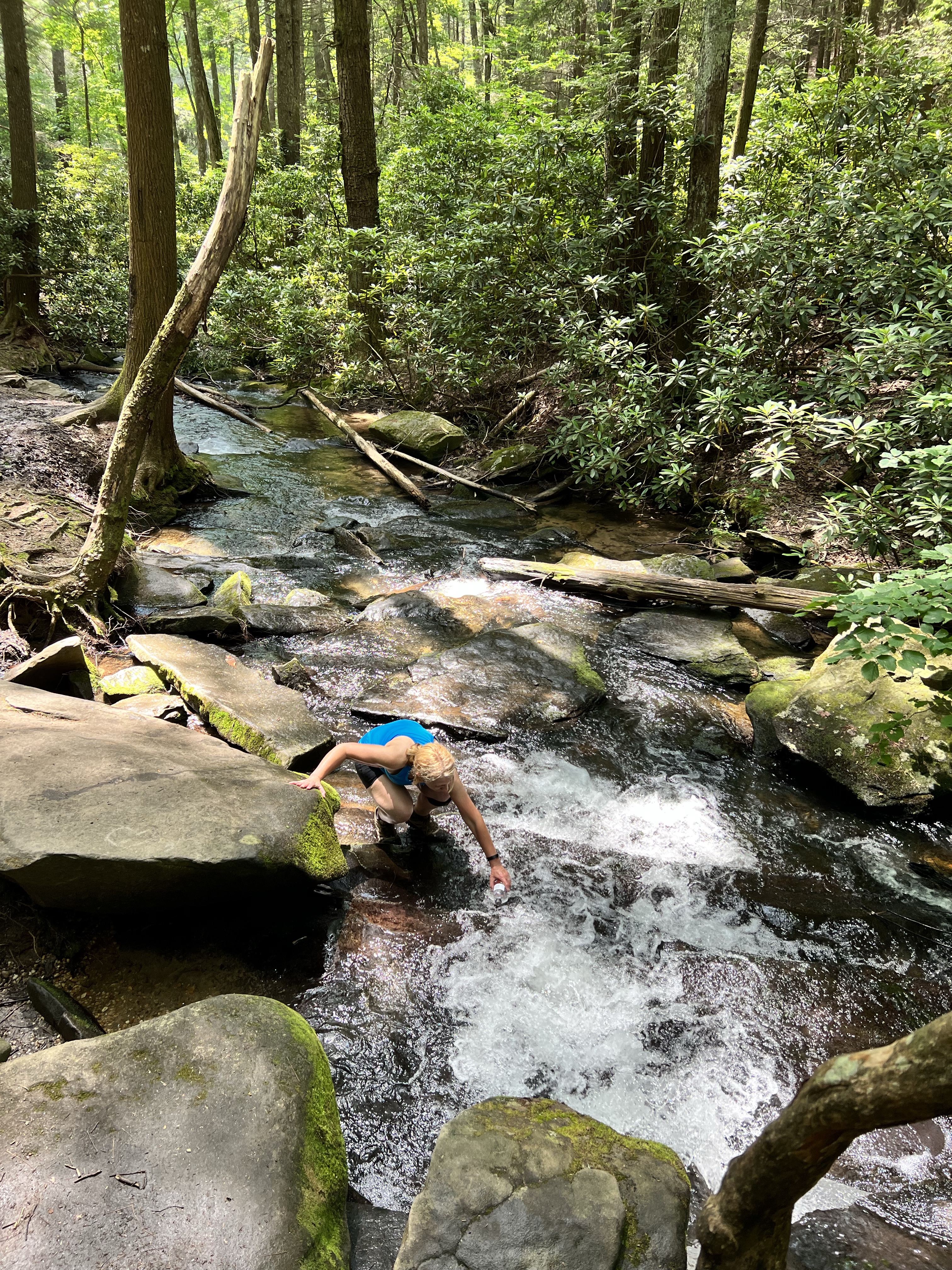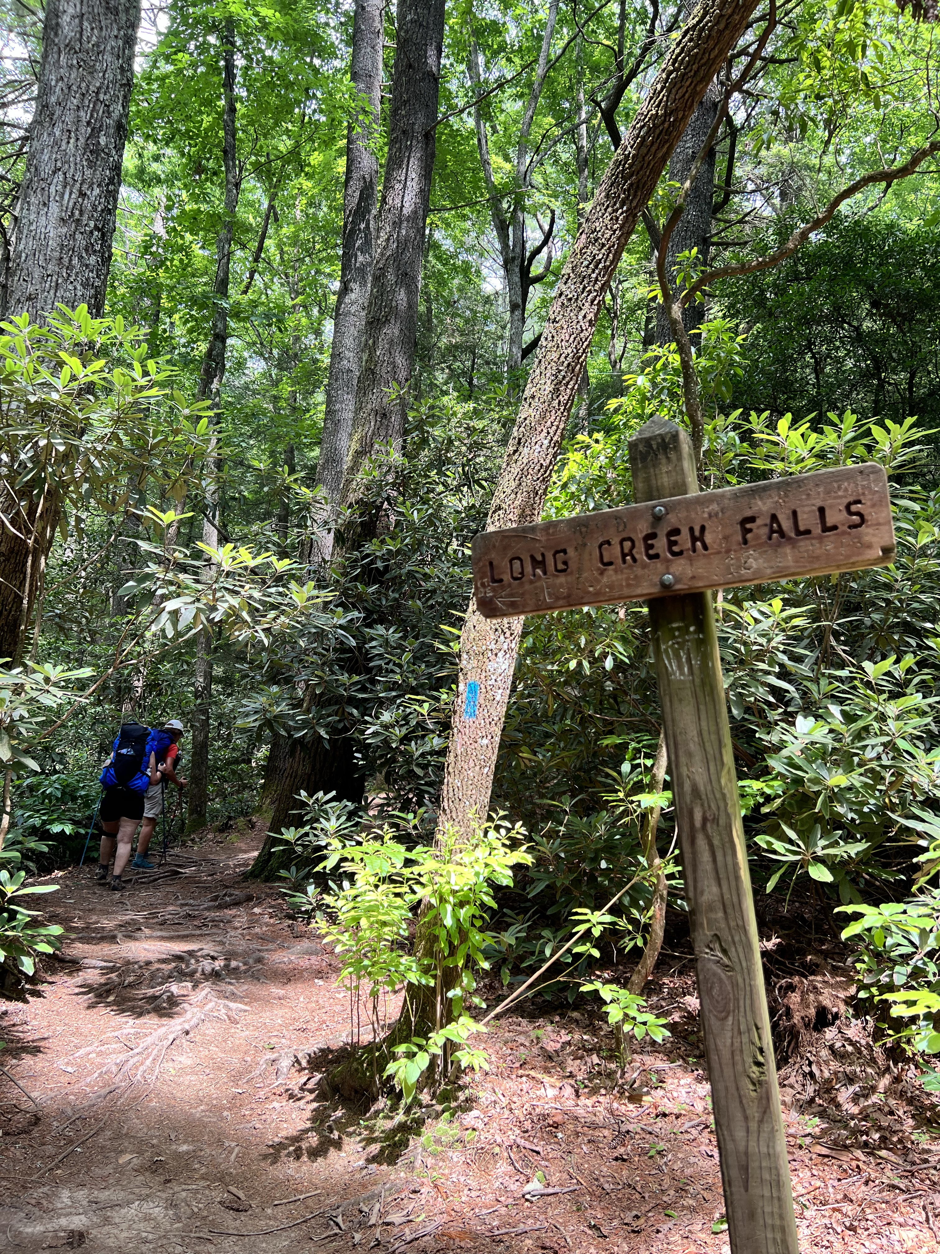 We hiked a little over eight miles that first day. In Florida, eight miles does not seem like much. But those miles kicked my butt! Going uphill took my breath away, and going downhill killed my knees. This is where I tell you that hiking is not always beautiful. It didn’t happen until the second day, but there was a period where I almost cried because my knees were hurting so badly. I’m just not used to going downhill like that. Cathy was having trouble with her knee too. But we pressed on. And on and on. We took a little side trail to Long Creek Falls. It was absolutely beautiful there! The cool mist coming off the waterfall felt so good after being so hot! We refilled our water bottles here. I just put my sawyer filter right on my smart water bottle and drank it, and it was so cool and refreshing!