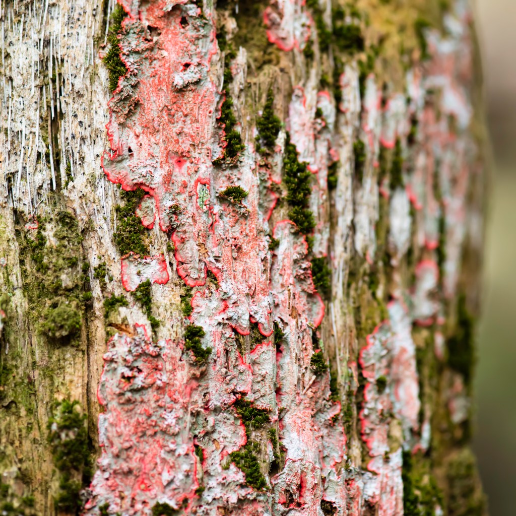 Let’s talk about lichen. You know the splotches of color you see on trees, sometimes white, sometimes green, sometimes a beautiful dark pink color – that’s lichen. Lichen is not a plant. It’s an organism that’s made up of fungi and algae. They don’t have roots, stems, or leaves. The algae part of the lichen provides nutrients through photosynthesis. The fungi attaches to the tree and hold the lichen in place. Lichen are very important for humans because they absorb everything in the atmosphere, including pollution. They also convert carbon dioxide to oxygen. Algae, such as that in lichen, produces 70% of the world’s oxygen! We have about 3600 species of lichen in North America. Lichen like sunny, moist areas. They’re often found on trees that are older and in declining health. The lichen doesn’t harm the tree, the tree just happens to have bare areas where light can get through and the lichen can thrive. Lichen can be an indicator of air quality because it thrives where the air quality is good.