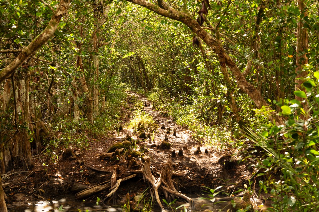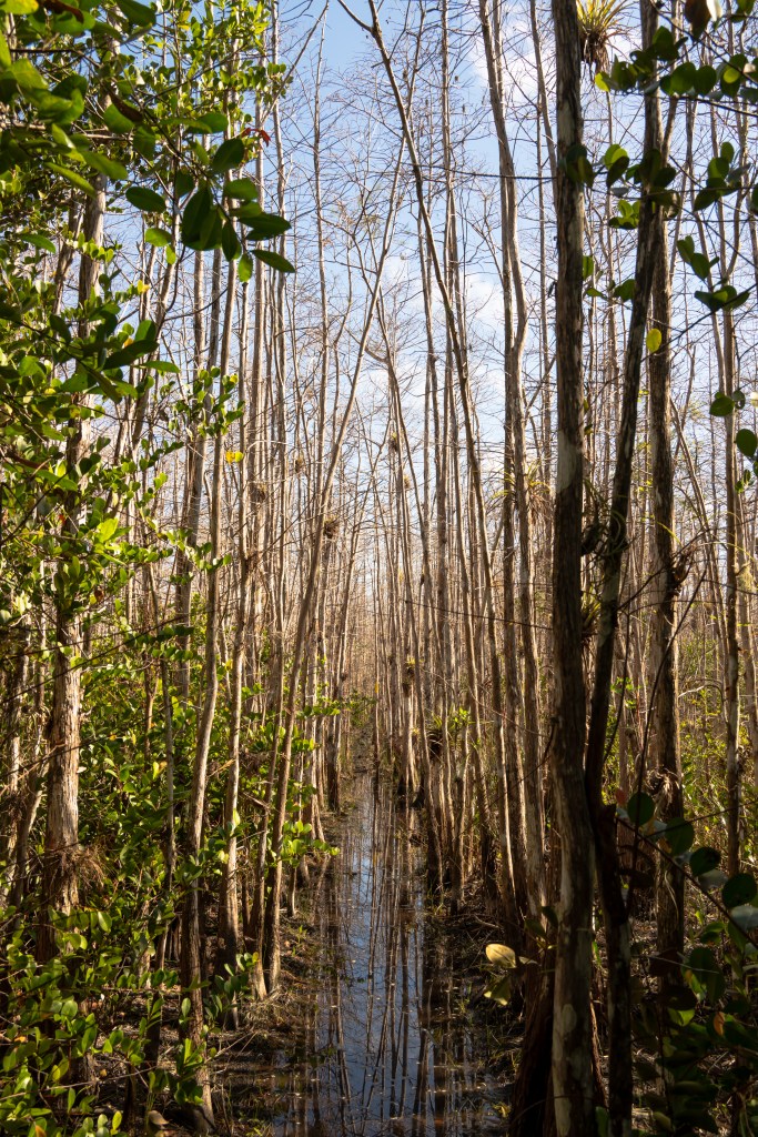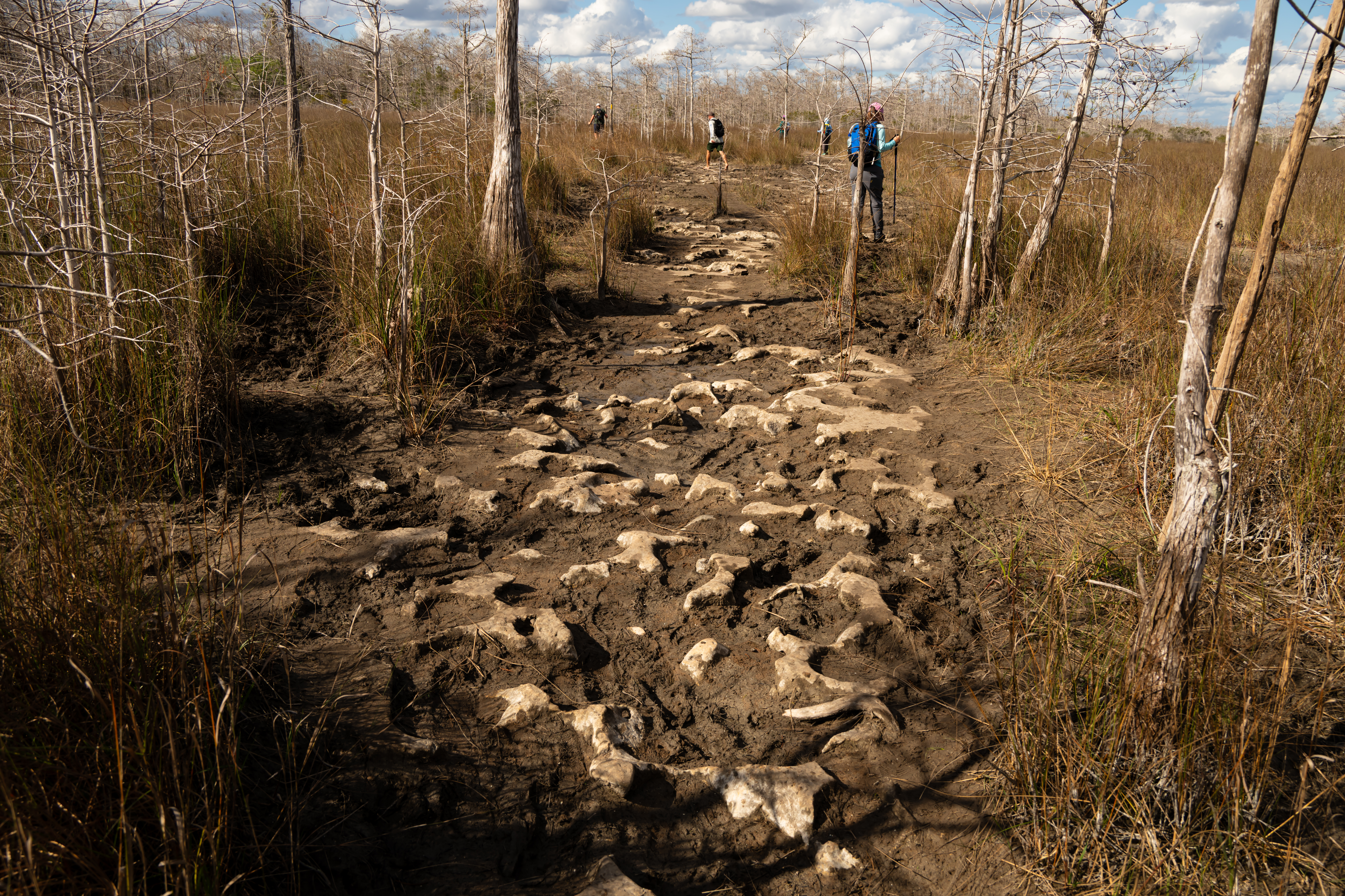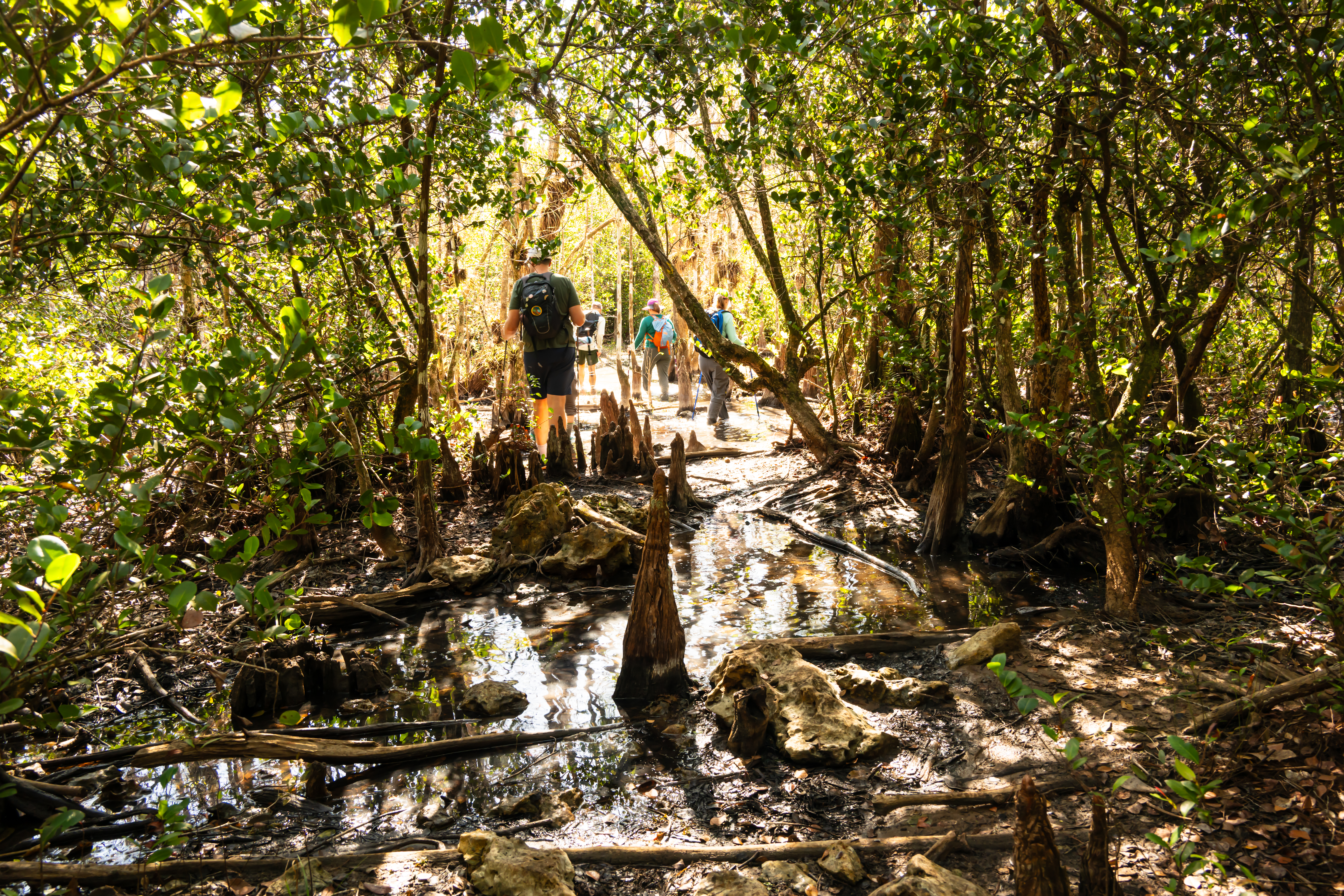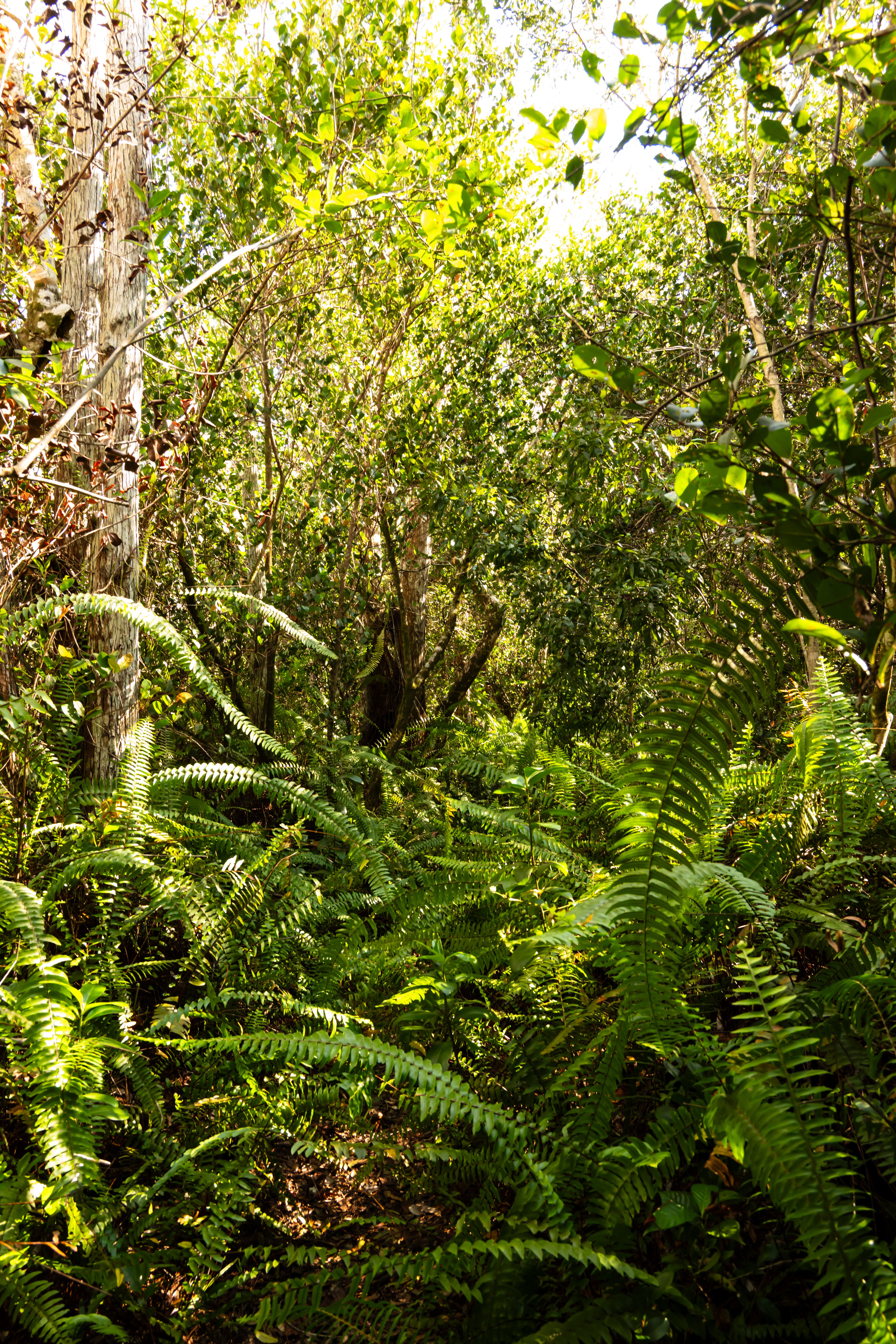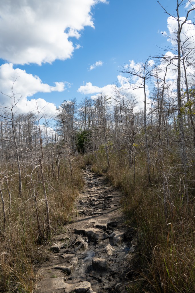 When you first set foot on the trail, it will seem like any other trail, but a couple of hundred feet further, and you enter a wild limestone landscape. This is a very diverse trail, where you’ll enjoy a trek through wet swamp and a dry mixed hardwood hammock full of ferns and cypress knees. Click on the photos below to enlarge and get a feel for the trail. These are all various points along the trail. Yes, even the water. We went during the dry season, but even so water was knee high in many places. I recommend trail runners and lightweight wool socks for this type of terrain. Waterproof shoes will just trap water inside and be miserable. If you do this hike, be sure you bring plenty of water and sun protection. That sun can be brutal when you pop out of the cypress island and into the cypress swamp where there is little shade.